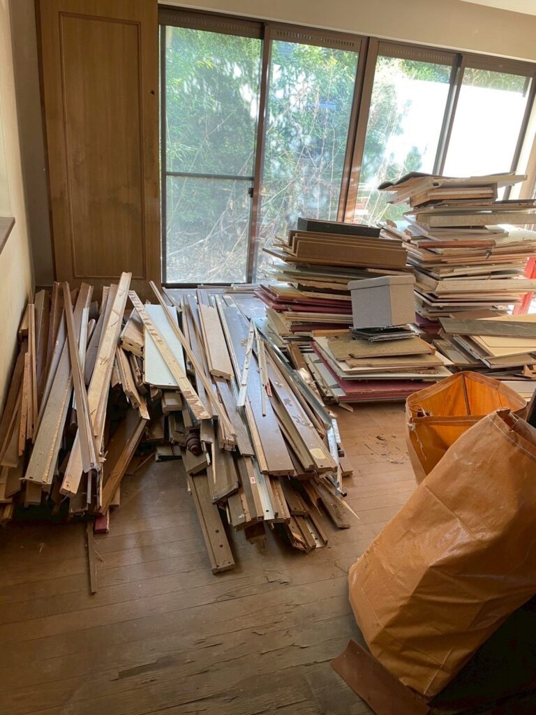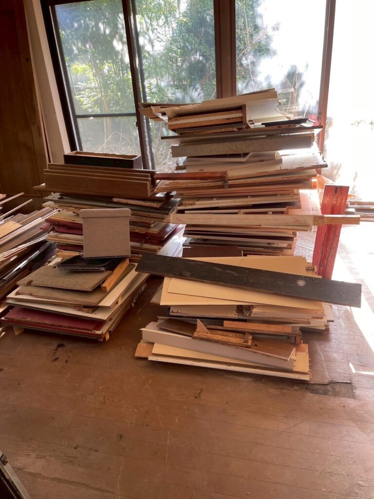建具や壁や絨毯を解体しており、積みあがっております😁