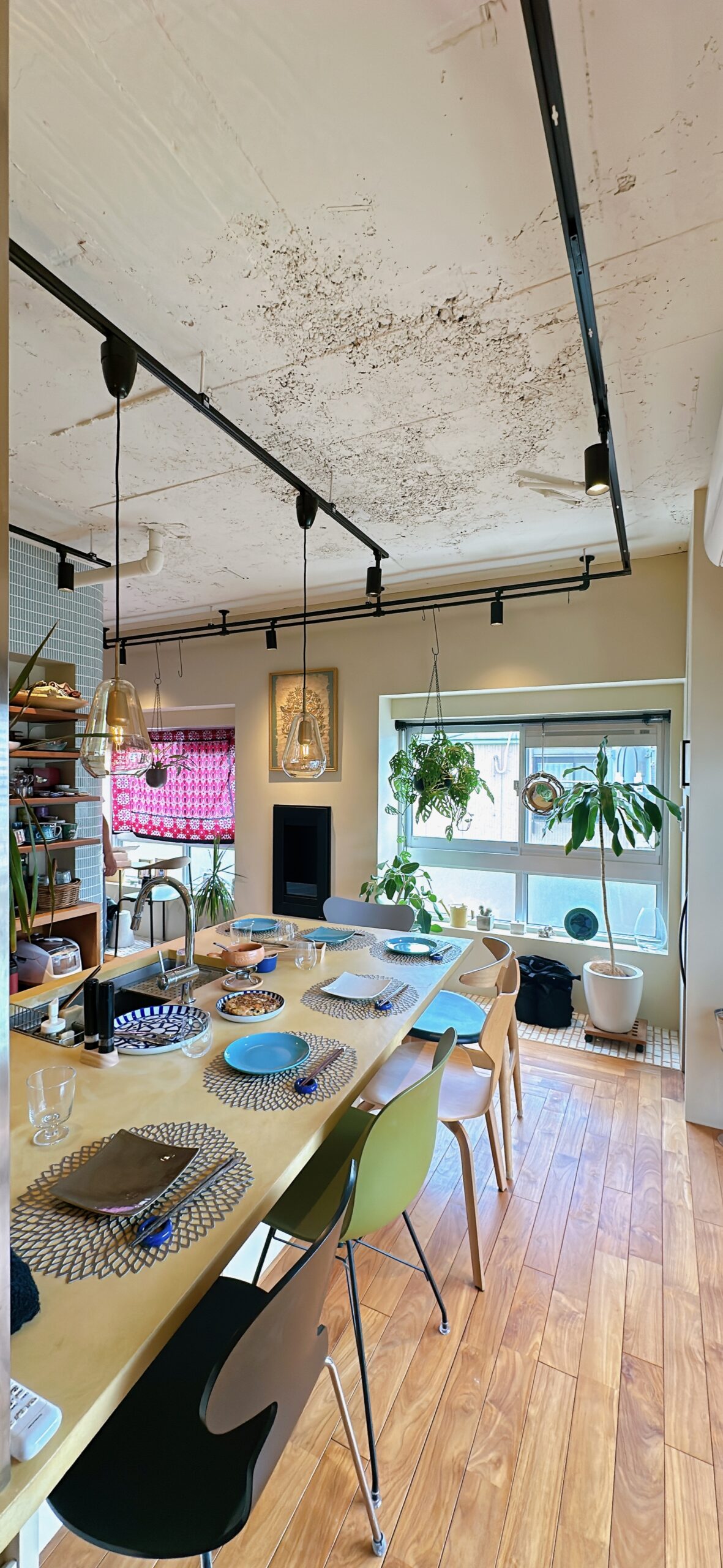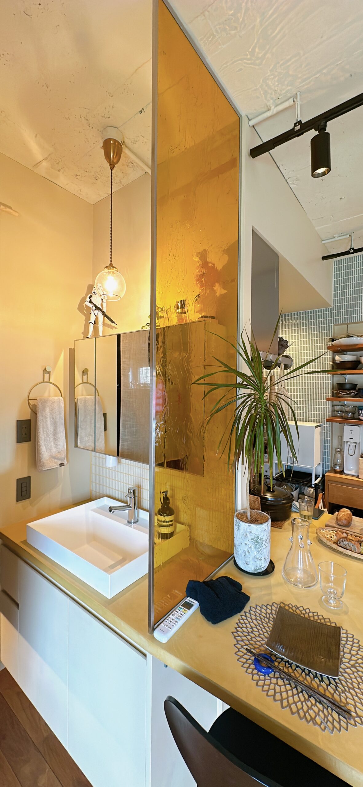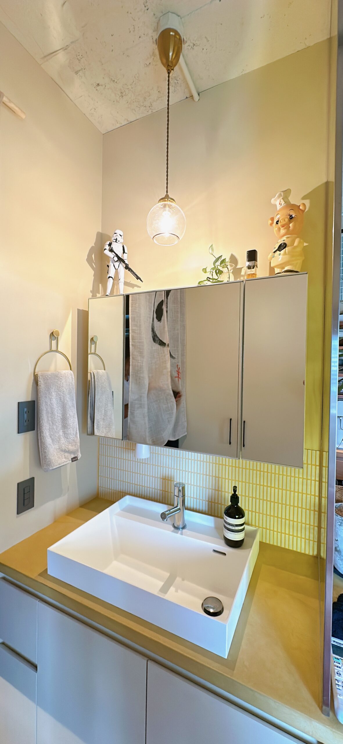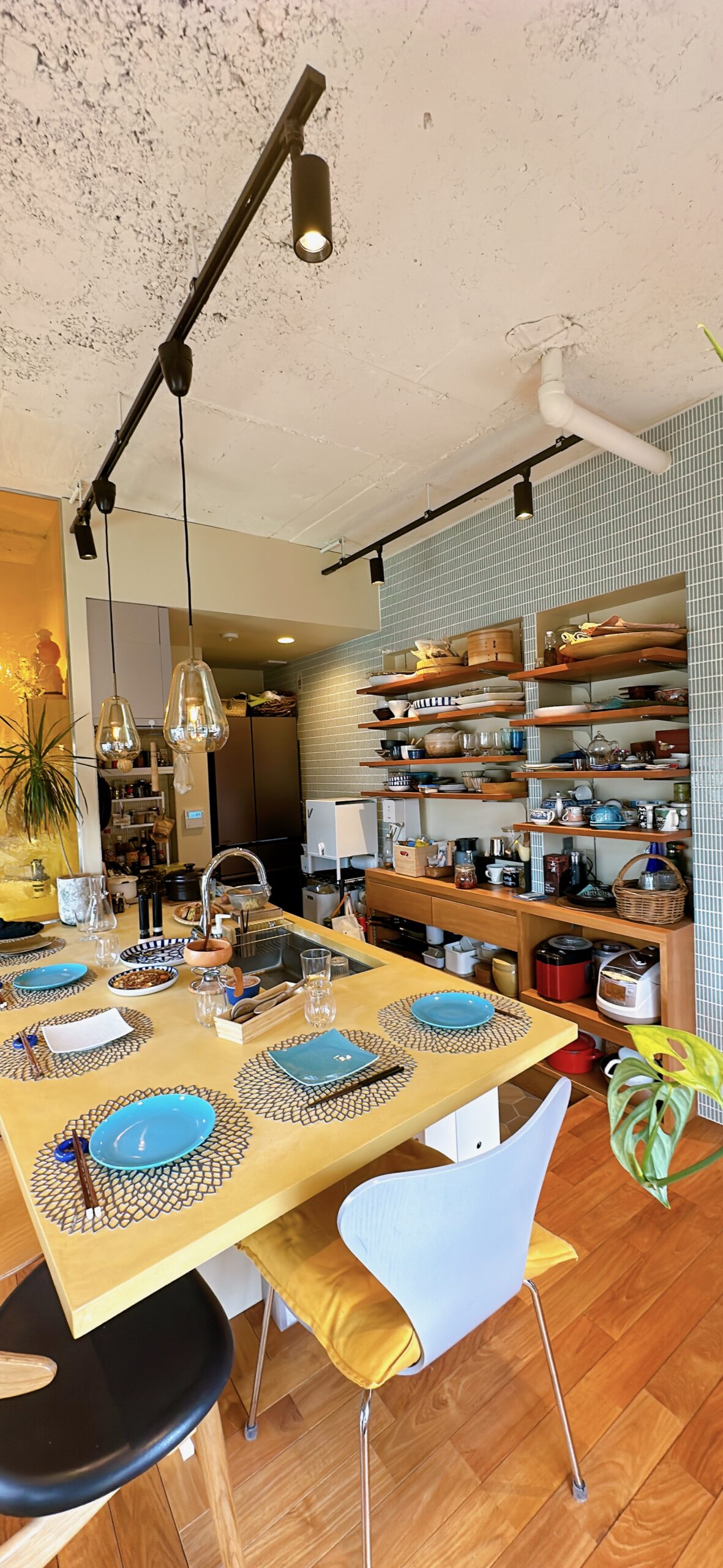 まずは、イエローのモールテックスで仕上げられた大きなキッチン兼カウンター。