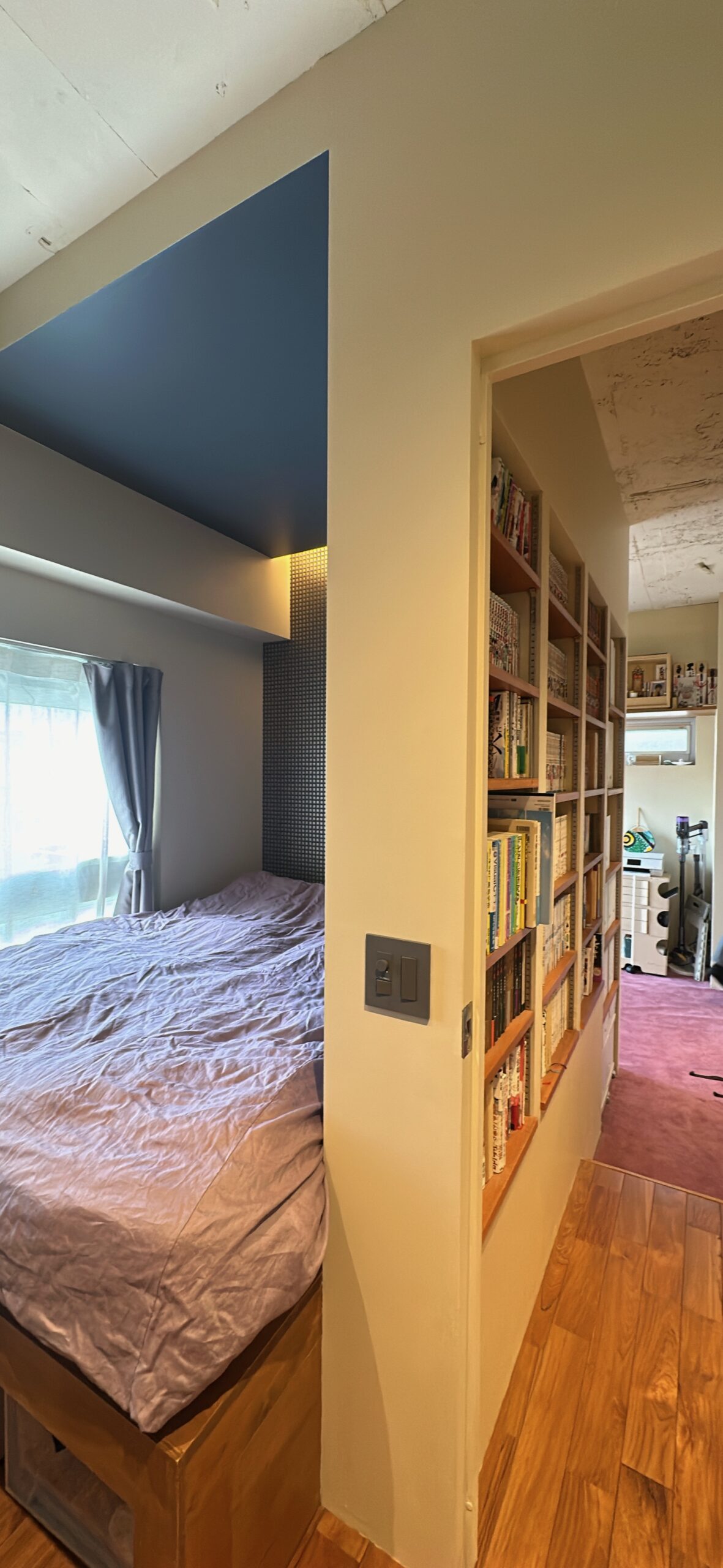 プライベートペースは、通路に本棚を設けたり、収納とベットを掛け合わせりと有効活用。